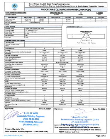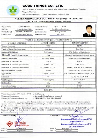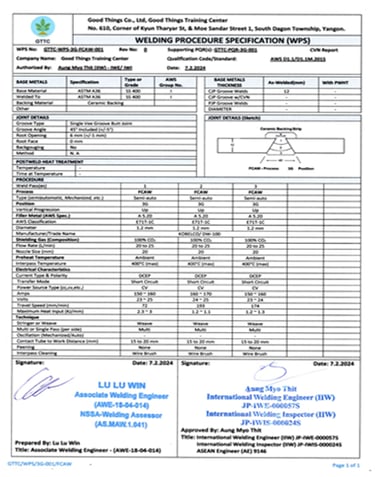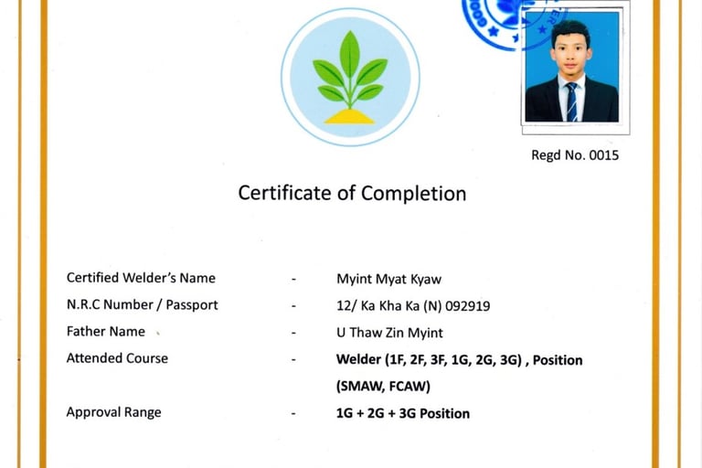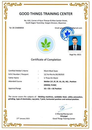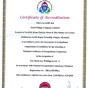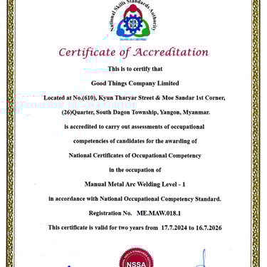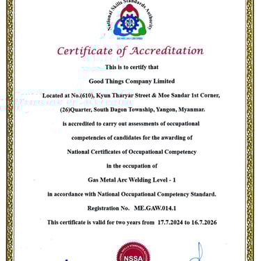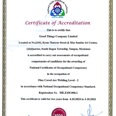 Good Things Welding Training Center တွင် National Skills Standards Authority (NSSA) မှ ကျင်းပပြုလုပ်တဲ့ Welder Qualifications Test Level 1 နှင့် Level 2 စာမေးပွဲများကို ကျင်းပပြုလုပ်လျက်ရှိပါသည်။ မည်သူမဆို ဝင်ရောက်ဖြေဆိုနိုင်ပြီး အောင်မြင်သူများကို National Skills Standards Authority (NSSA) ရဲ့ Welder Certificate တွေဖြစ်သည့် (1) Manual Metal Arc Welder Level 1, Level 2 (2) Flux Cored Arc Welder Level 1 , Level 2 (3) Gas Metal Arc Welder Level 1, Level 2 တို့ကို ထိုက်တန်စွာ ရရှိမည်ဖြစ်ပါသည်။