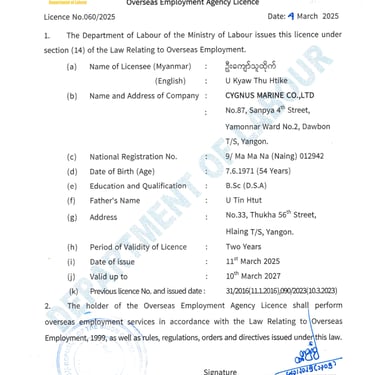 Cygnus Marine ပြည်ပအလုပ်အကိုင်ရှာဖွေရေး အေဂျင်စီ မှကြိုဆိုပါတယ်။