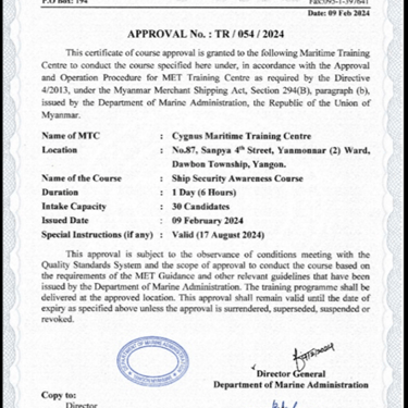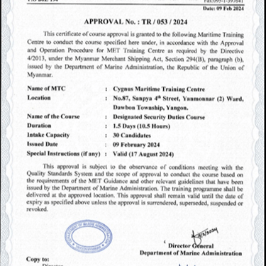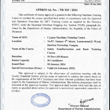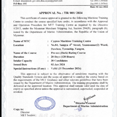 Established in 2013, Our Maritime Training Centre is a beacon of excellence in maritime education. Endowed with licenses from the Department of Marine Administration and ISO 9001:2015 certification from Bureau Veritas, we stand as a trusted institution. Our focus lies in shaping the next generation of seafarers. Following the curriculum mandated by the Department of Marine Administration Myanmar, we offer comprehensive training in Basic Safety Training (B.S.D), Pre-sea, Deck and Engine Simulator, and Ship Security Awareness (S.S.A).With experienced instructors and state-of-the-art facilities, we blend theoretical knowledge with practical expertise, preparing our trainees for the challenges of life at sea. At Our Maritime Training Centre, we don't just educate; we inspire and empower, guiding aspiring seafarers toward a successful and fulfilling career on the open seas.
